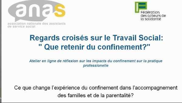 Travail social apprendre du confinement #2 Accompagner autrement les familles et la parentalité Afin d’outiller les intervenants sociaux dans leurs pratiques professionnelles en cette période de réaménagements nombreux, la fédération des acteurs de la solidarité et l'ANAS se sont associées pour élaborer des mini-conférence de témoignages en ligne sur des sujets clés et pour lesquels intervenants sociaux de tous métiers ont dû s’adapter, innover et faire évoluer leur pratiques. L’idée...