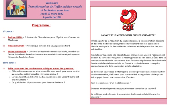 Webinaire organisé par l'Union Syndicale Départementale CGT Nord Organisé par l'Union Syndicale Départementale CGT Nord Argumentaire : LA SANTÉ ET LE MÉDICO-SOCIAL QUELLES SOLIDARITÉS ? Initiée à partir de la réduction du coût de la santé, la transformation des soins et de l’offre médico-sociale symbolise l’avènement de notre société néo-libérale ainsi que la fin des solidarités collectives et de la protection des plus vulnérables. Produits par la pensée néo-libéraliste, ces changements...