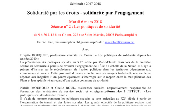 Séminaire 2017-2018 Solidarité par les droits - solidarité par l’engagement Mardi 6 mars 2018 Séance n° 2 : Les politiques de solidarité de 9 h 30 à 12 h au Cnam, 292 rue Saint Martin, 75003 Paris, amphi A Entrée libre, mais inscription obligatoire auprès de : zaia.rehiel@lecnam.net