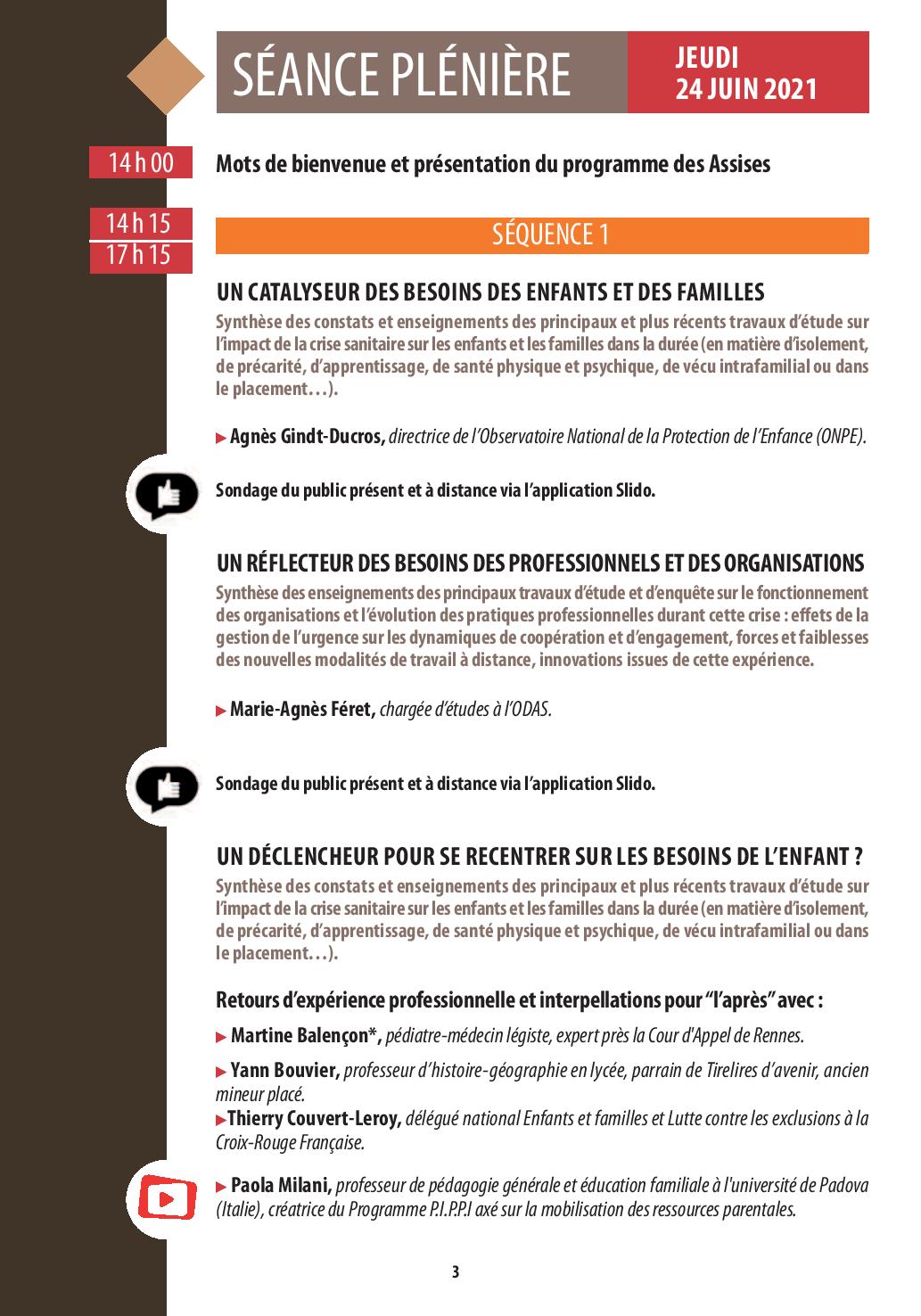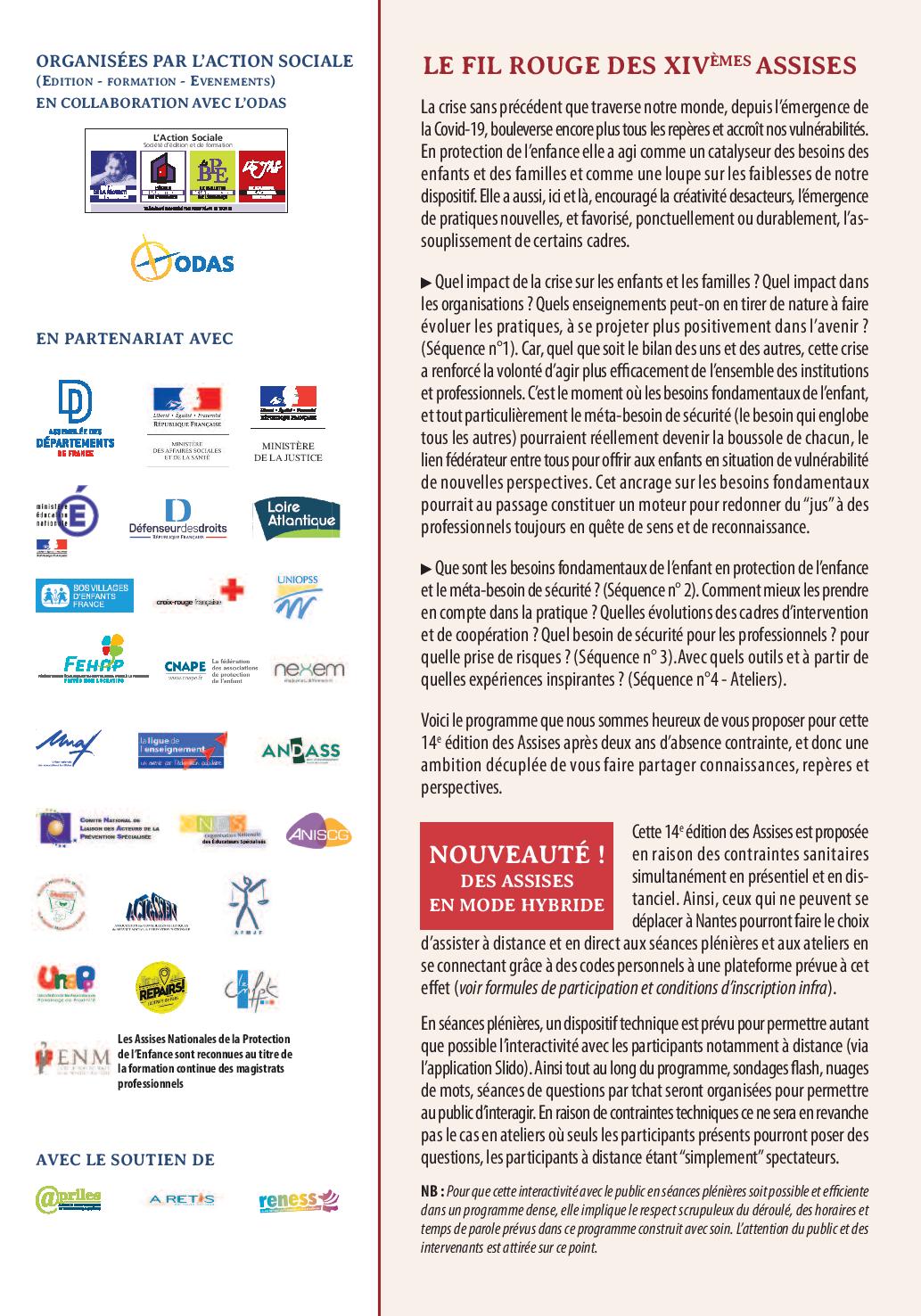 Les Assises constituent le seul événement transversal de cette importance dans le champ de la protection de l’enfance, et c’est donc chaque année un événement très attendu, durant lequel de nombreuses personnalités de divers univers (psychiatres, philosophes, sociologues, artistes) sont présents sur scène pour apporter leurs regards : Boris Cyrulnik, Serge Hefez, Irène Théry, Jean-Pierre Winter, Gilles Lipovetsky, Yvan Jablonka, Jean-Pierre Tavoillot, ou les réalisatrices Emmanuelle Bercot, Jeanne Herry, le youtubeur Jhon Rachid et tant d’autres. À leurs côtés, chaque année, les principaux responsables politiques nationaux et locaux (ministres, présidents des conseils départementaux, hauts responsables institutionnels comme le Défenseur des droits) et professionnels de terrain créatifs et inspirants pour partager leur savoir-faire.