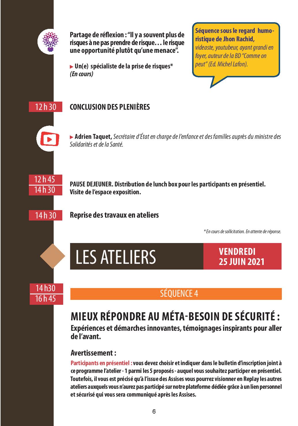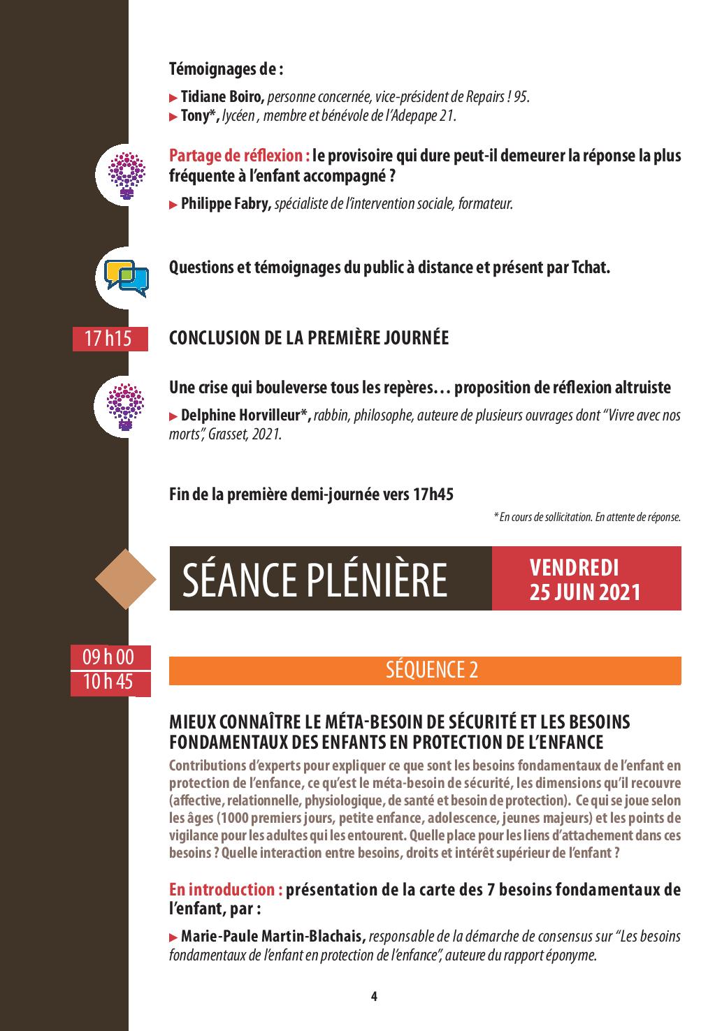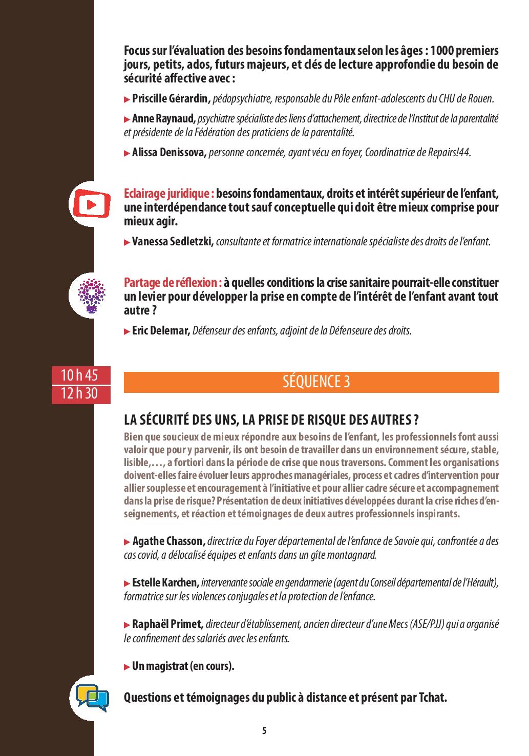 ▶Que sont les besoins fondamentaux de l’enfant en protection de l’enfance et le méta-besoin de sécurité ? (séquence n° 2). Comment mieux les prendre en compte dans la pratique ? Quelles évolutions des cadres d’intervention et de coopération ? Quel besoin de sécurité pour les professionnels ? pour quelle prise de risques ? (séquence n° 3). Avec quels outils et à partir de quelles expériences inspirantes ? (séquence n°4 - Ateliers).