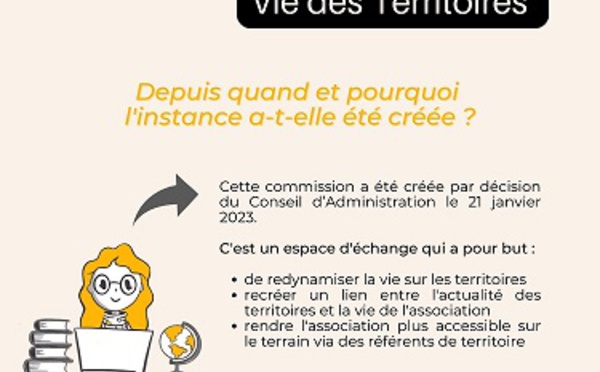 [𝗭𝗢𝗢𝗠 𝗦𝗨𝗥...] La Commission Vie des Territoires... On vous en dit plus La vie de notre association est riche en échanges, en partages et en travaux ! 𝑃𝑜𝑢𝑟 𝑟𝑒𝑛𝑑𝑟𝑒 𝑝𝑙𝑢𝑠 𝑣𝑖𝑠𝑖𝑏𝑙𝑒 𝑛𝑜𝑠 𝑐𝑜𝑛𝑡𝑟𝑖𝑏𝑢𝑡𝑖𝑜𝑛𝑠 𝑒𝑡 𝑣𝑜𝑢𝑠 𝑑𝑜𝑛𝑛𝑒𝑟 𝑒𝑛𝑣𝑖𝑒 𝑑𝑒 𝑣𝑜𝑢𝑠 𝑖𝑛𝑣𝑒𝑠𝑡𝑖𝑟 𝑎̀ 𝑛𝑜𝑠 𝑐𝑜̂𝑡𝑒́𝑠, 𝑛𝑜𝑢𝑠 𝑝𝑟𝑜𝑝𝑜𝑠𝑜𝑛𝑠 𝑐𝑒 𝑓𝑜𝑟𝑚𝑎𝑡 "𝑍𝑜𝑜𝑚 𝑠𝑢𝑟" 𝑎𝑓𝑖𝑛 𝑑𝑒 𝑣𝑜𝑢𝑠 𝑝𝑟𝑒́𝑠𝑒𝑛𝑡𝑒𝑟 𝑙𝑒 𝑓𝑜𝑛𝑐𝑡𝑖𝑜𝑛𝑛𝑒𝑚𝑒𝑛𝑡 𝑑𝑒 𝑛𝑜𝑠 𝑐𝑜𝑚𝑚𝑖𝑠𝑠𝑖𝑜𝑛𝑠 𝑒𝑡 𝑑𝑒𝑠 𝑖𝑛𝑠𝑡𝑎𝑛𝑐𝑒𝑠 𝑛𝑎𝑡𝑖𝑜𝑛𝑎𝑙𝑒𝑠 𝑎𝑢𝑥𝑞𝑢𝑒𝑙𝑙𝑒𝑠 𝑛𝑜𝑢𝑠 𝑝𝑎𝑟𝑡𝑖𝑐𝑖𝑝𝑜𝑛𝑠 ! Pour cette 4e présentation, c'est au tour de la Commission Vie des Territoires,...