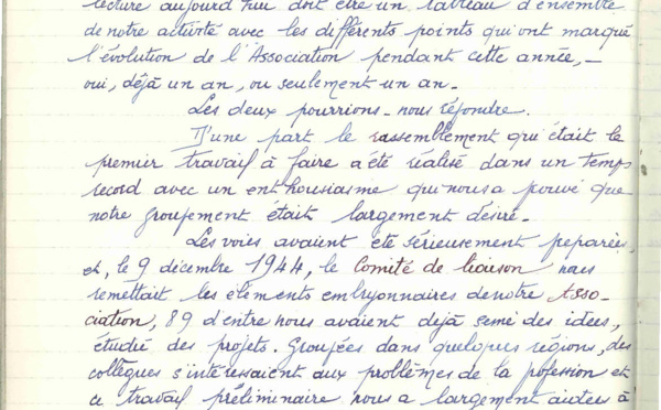 Le registre de l'Association entre 1945 et 1949. Il s'agit du premier registre de l'Association qui servait à consigner les procès verbaux des Assemblées Générales. Il comprend toute sorte d'éléments décrivant les premiers temps de la vie de l'Association.